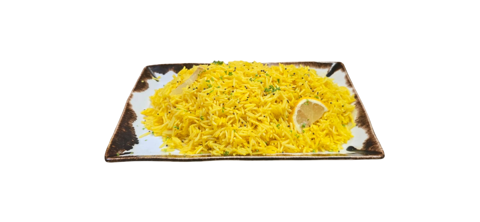 Basmati rice with mustard seeds, curry leaves, coconut, lemon